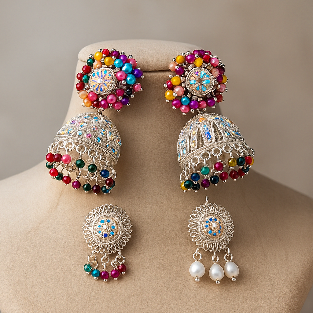 Add a pop of color to your look with these stunning handcrafted jhumka earrings. Featuring vibrant multicolored beads and intricate silver detailing, these earrings are perfect for festive occasions, weddings, and parties.