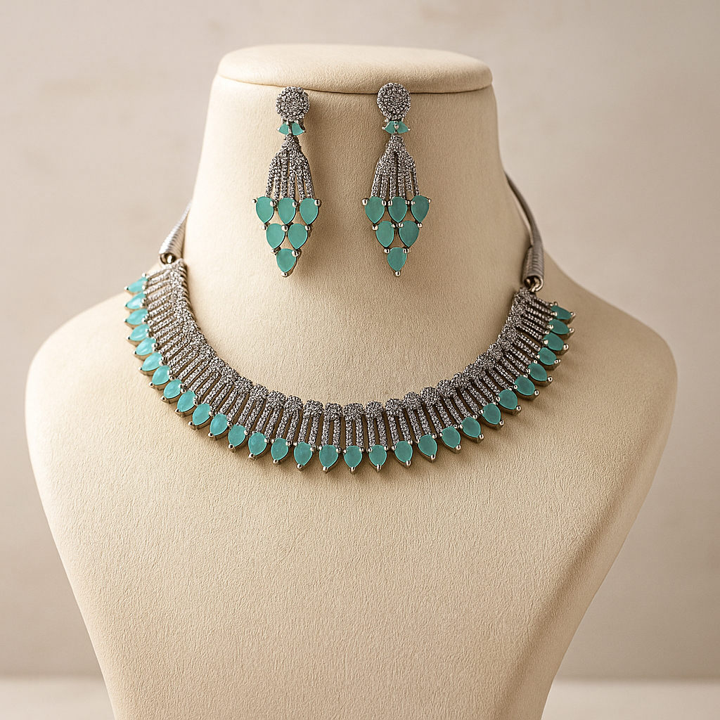ELEGANT DESIGN: Art Deco-inspired necklace and earring set featuring stunning turquoise blue teardrop crystals and silver-toned metalwork