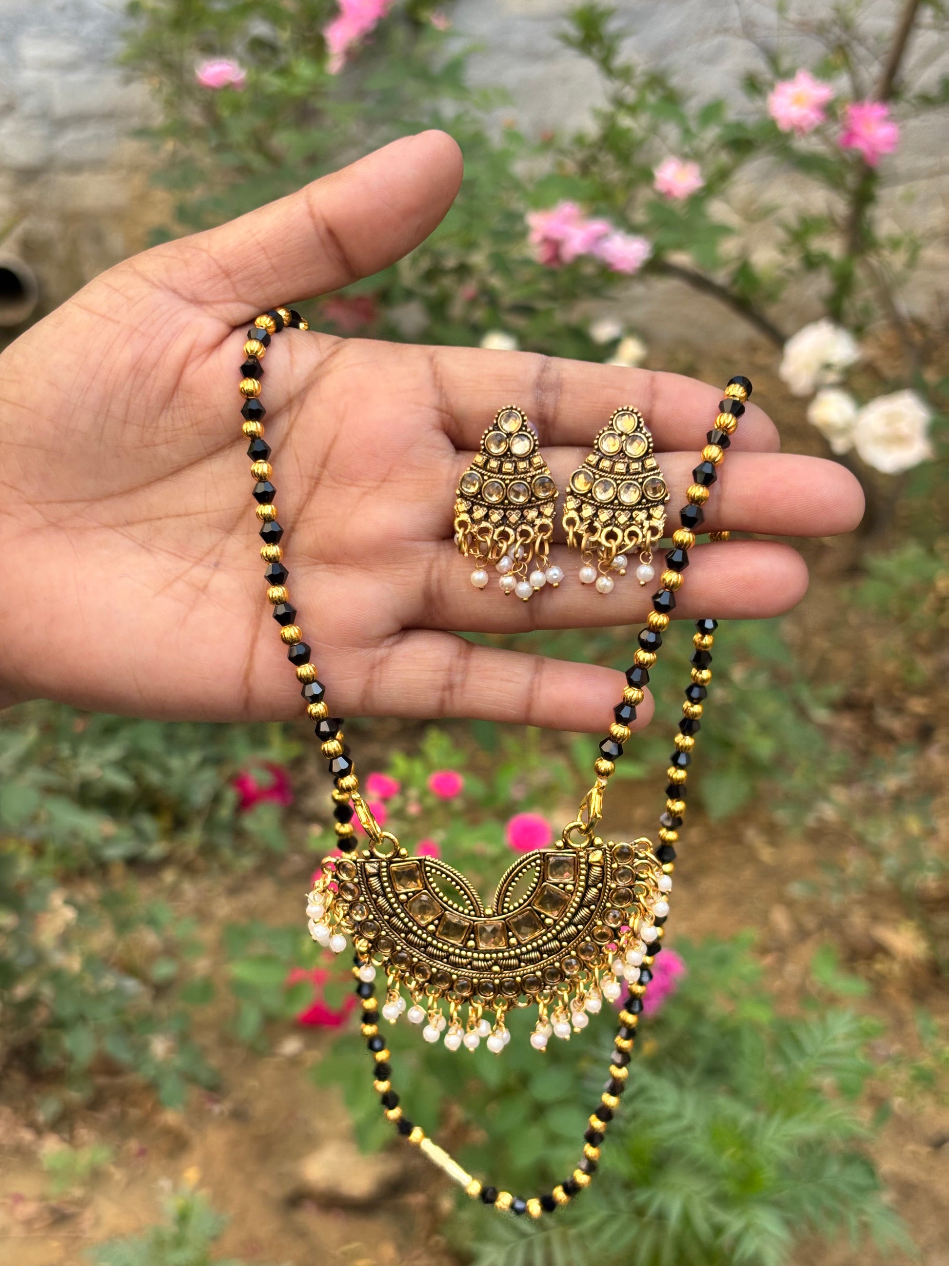 Discover the perfect blend of tradition and elegance with this exquisite gold-plated mangalsutra and earrings set. Adorned with intricate detailing and pearl accents, this stunning jewelry piece adds charm to any occasion.
