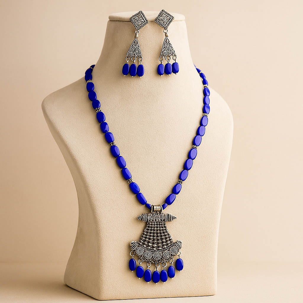NECKLACE DETAILS: Statement necklace crafted with high-quality purple beads, adorned with a large medallion-style pendant featuring traditional motifs