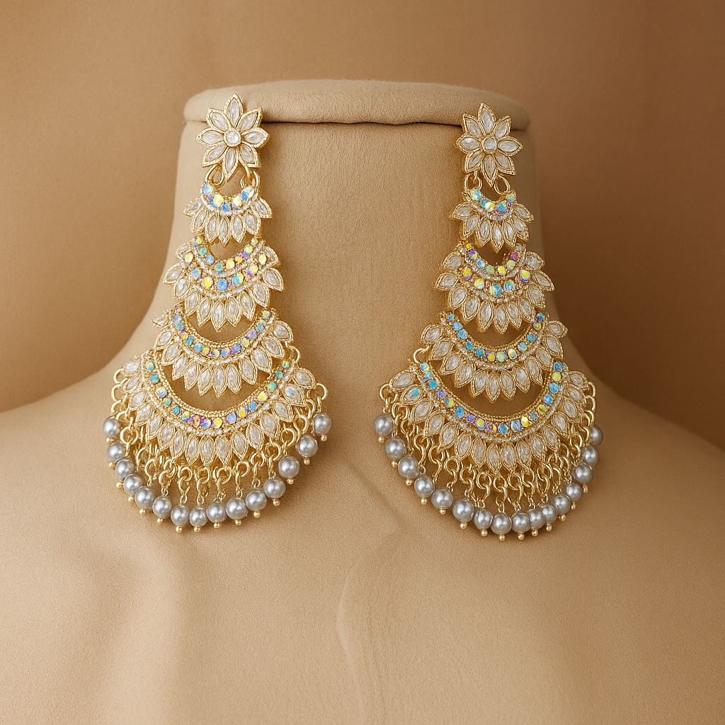 Discover the beauty of these stunning chandelier earrings adorned with pearls and sparkling gemstones. Perfect for bridal wear, festive occasions, or statement jewelry lovers. Handcrafted with intricate detailing for an exquisite touch.